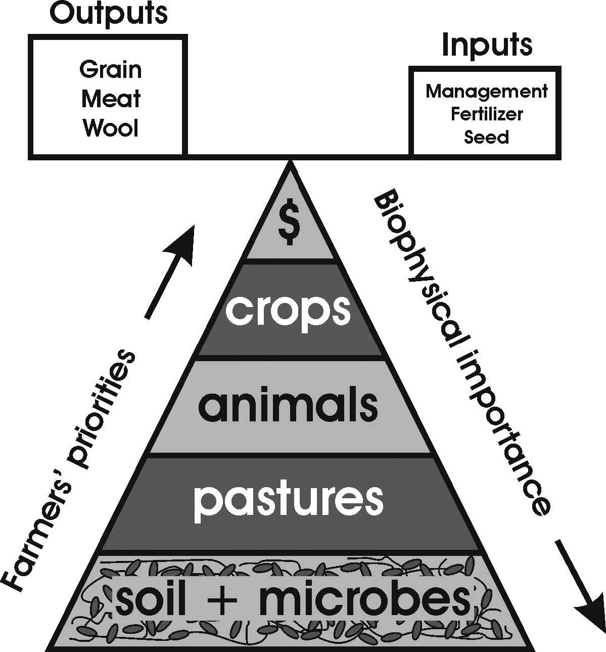 Dependencies between layers of factors contributing to sustainability: The relationship between the functional components of a farm can be viewed as a hierarchy of inter-dependent layers, with the most basic being the soil and its microbial populations (Figure 9). There is a dilemma posed by the priorities of farmers in a laissez faire economy which are focused towards the apex of the triangle whilst the biophysical importance of the layers is greatest towards the base.