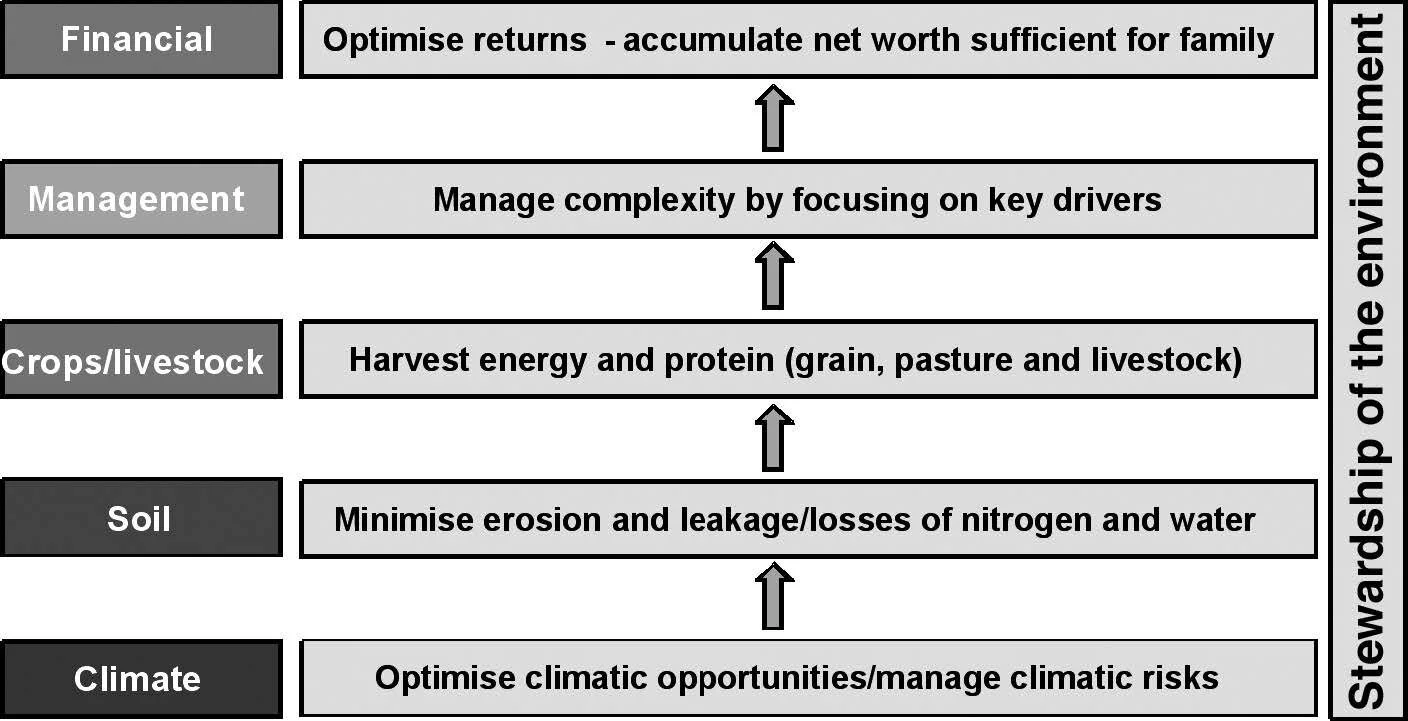 Figure 10. Diagram showing simplified dependencies between climate, soil, crop, livestock, management and financial layers of sustainability and the outcomes which need to be achieved in sustainable farming enterprises.